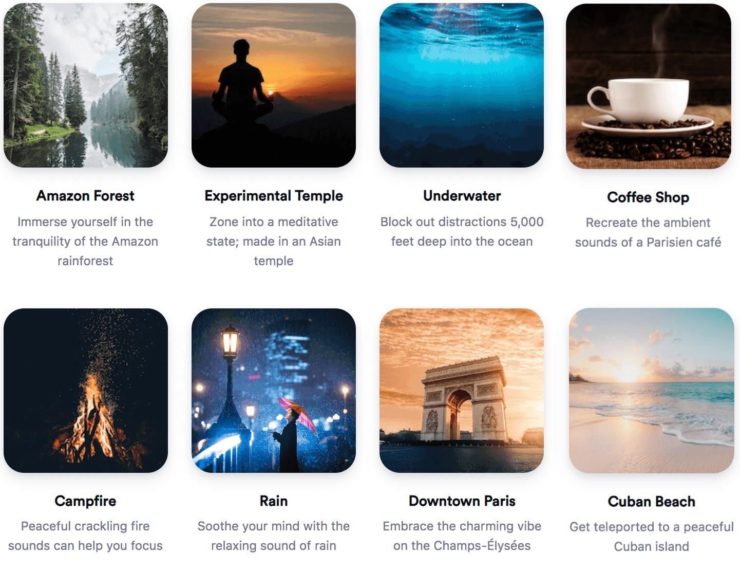 Rofocus offers the most comprehensive set of ambient environments (over fifteen carefully crafted sounds!) to ensure you can choose where you fit in best.