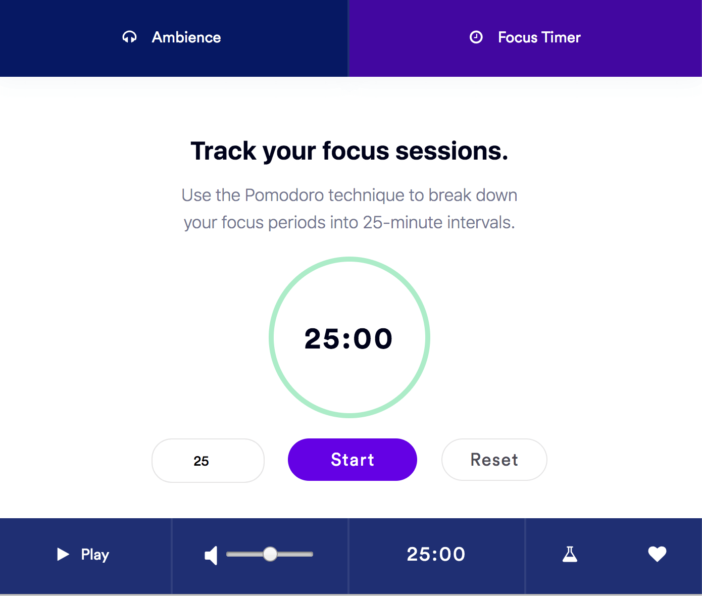 Aim for 25 minute focus intervals if you want to use the Pomodoro technique - you can also customize the timer to whatever suits your routine best.